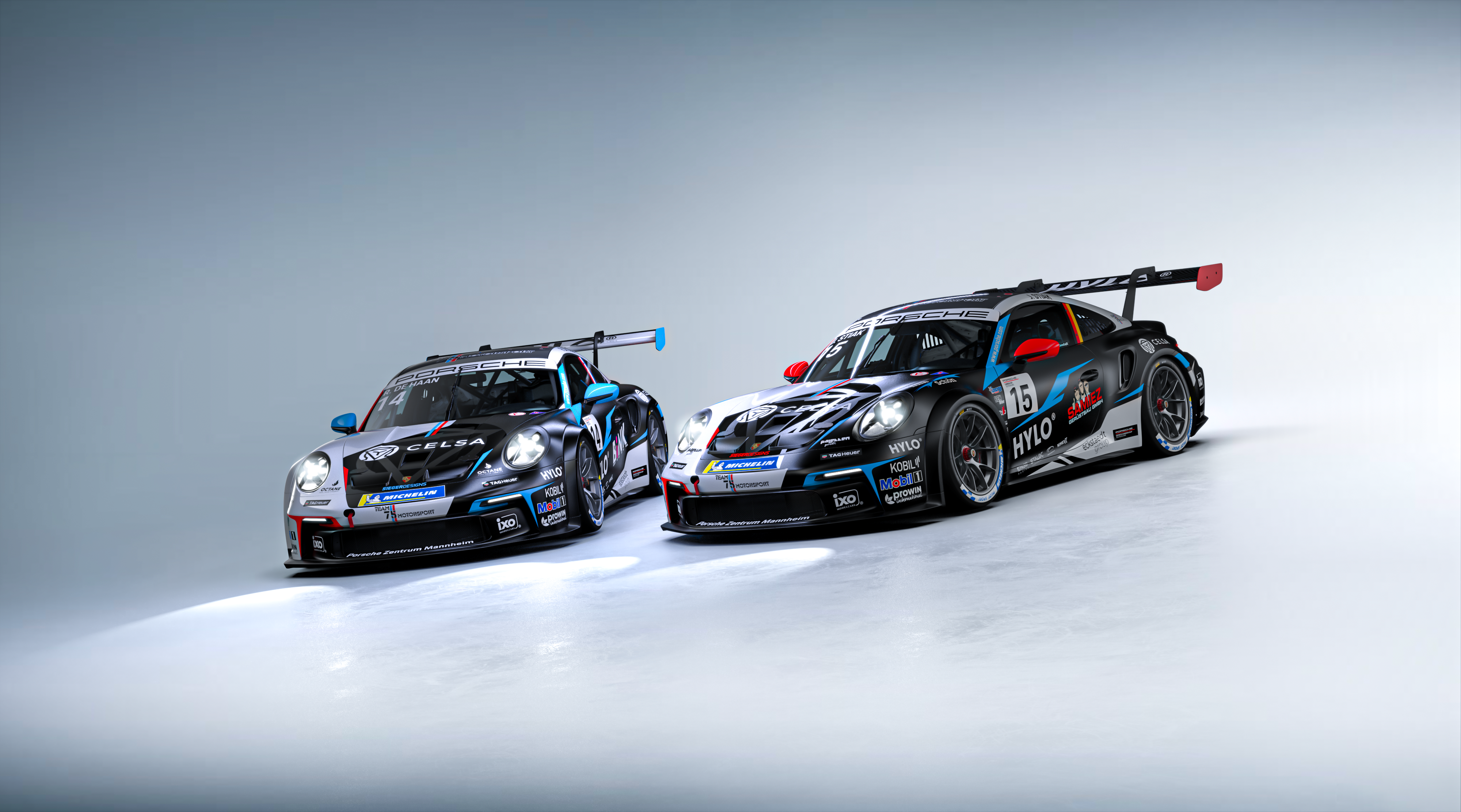 Weitere farbliche Akzente dienen auch der leichteren Unterscheidung: Das Auto mit der Startnummer 14 von Robert De Haan wird blaue, der Porsche mit der Startnummer 15 von Janne Stiak rote Außenspiegel tragen.